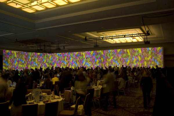 Asked by our partner Megavision arts to engineer and help design the projection for City National Banks managers meeting. There were 14 projectors blended accross both sides of this ballroom in Annaheim California. Each screen was 12 linear feet by 18 ft tall. All of the content came through a watch out system. Megavision created all content for this amazing event. Please call for further details.
